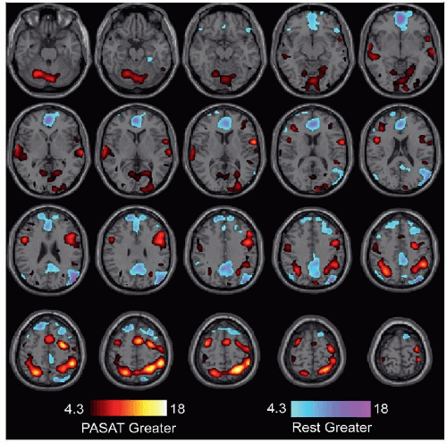 Activation map for an auditory PASAT task is shown for 1 patient. Image is the average of 2 sequences, 6-minutes each. Hot colors show greater activation during the PASAT blocks, and cool colors show greater activation during the rest blocks. Significance is set at q < 0.05, false discovery rate corrected. For the task, the patient listened to a list of single-digit numbers. Each time a new number was heard, she added in her mind the previous 2 numbers. Rest blocks contained no stimuli. Task activation is seen in auditory cortex, dorsolateral prefrontal cortex, intraparietal sulcus, medial cerebellum, frontal eye fields, and supplementary motor area. |